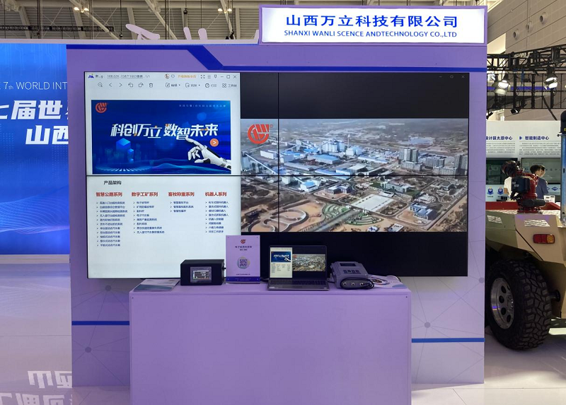 山西萬(wàn)立科技展臺,通過(guò)電子屏滾動(dòng)播放的方式全方位展示了智慧公路、數字工礦、畜牧稱(chēng)重、機器人四個(gè)系列產(chǎn)品。