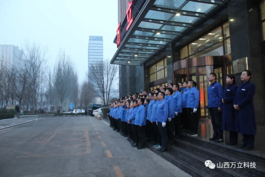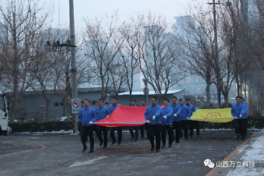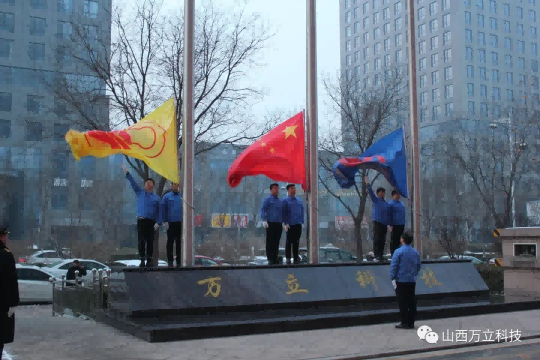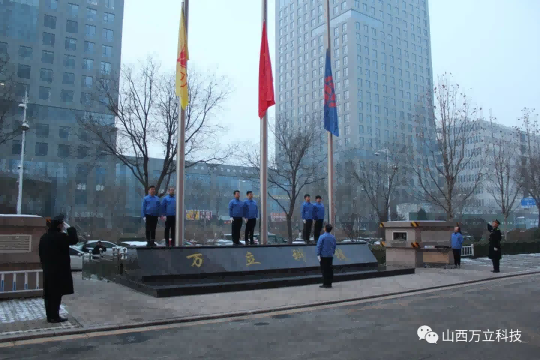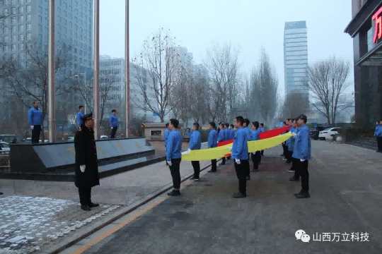 公司領(lǐng)導及全體員工精神抖擻,7時(shí)44分,升旗手和護旗方隊已整裝待發(fā),伴隨著(zhù)旋律流暢、豪邁雄壯的《中國人民解放軍進(jìn)行曲》,護旗方隊邁著(zhù)節奏規整且堅實(shí)的步伐向升旗臺走來(lái),展現出了萬(wàn)立人團結協(xié)作的團隊精神。當旗手將國旗、區旗、司旗移交升旗手,全體人員行注目禮時(shí),明亮雄偉的《義勇軍進(jìn)行曲》響起,旗幟緩緩升起,隨風(fēng)飄揚,像極了山西萬(wàn)立科技有限公司30多年來(lái)的堅定不移、腳踏實(shí)地,也體現了萬(wàn)立人的勇敢、堅強、團結一心。